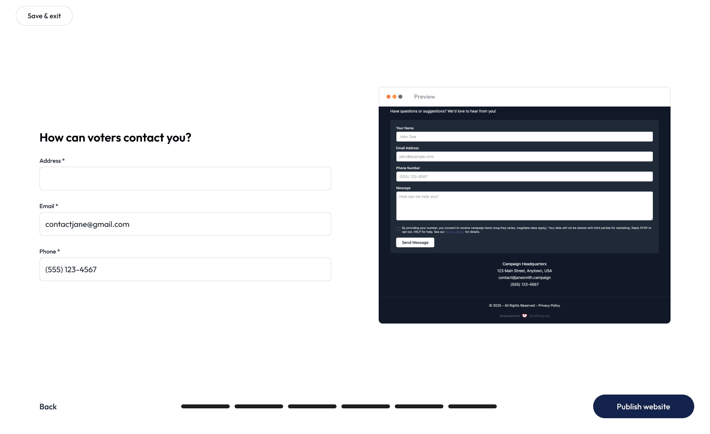 - Contact Form: Including a contact form lets voters reach out to you with questions and feedback. You can also include contact information, like your campaign email address, as an additional way for voters to reach out.