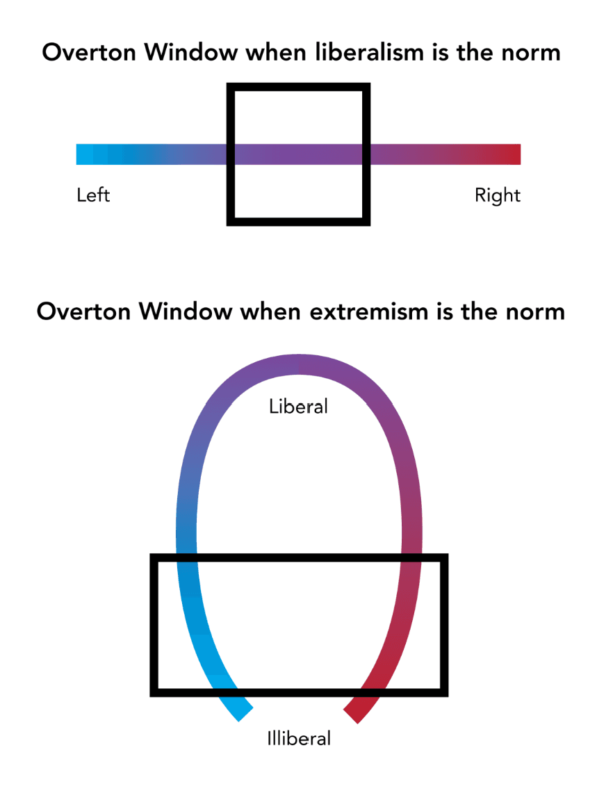 The Overton Window is normally depicted as brackets or a box on a line or ruler, with moderate views in the center and increasingly “extreme” or illiberal on either side of the center line. As extreme views become more mainstream, the window is viewed as having shifted to the left or right of what is considered sensible — read: moderate — public sentiment.