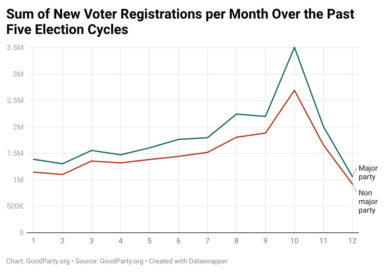 Monthly voter registration trends show that new Independent and major-party registrations follow nearly identical seasonal patterns.