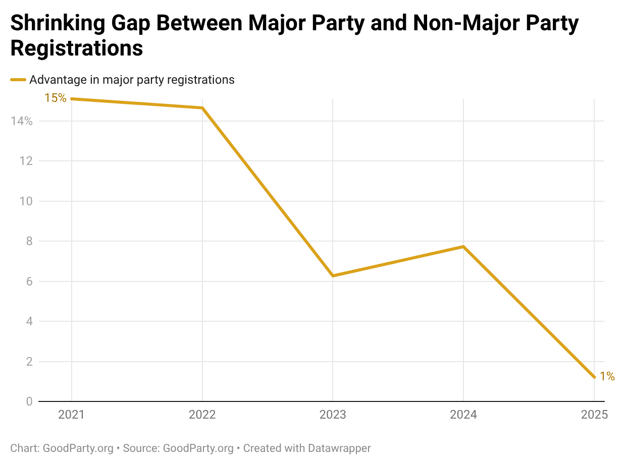 By 2025, that gap had narrowed to just one voter. Cycle after cycle, the registration advantage of the two major parties has steadily declined, and what was once a significant margin has now become virtually nonexistent.