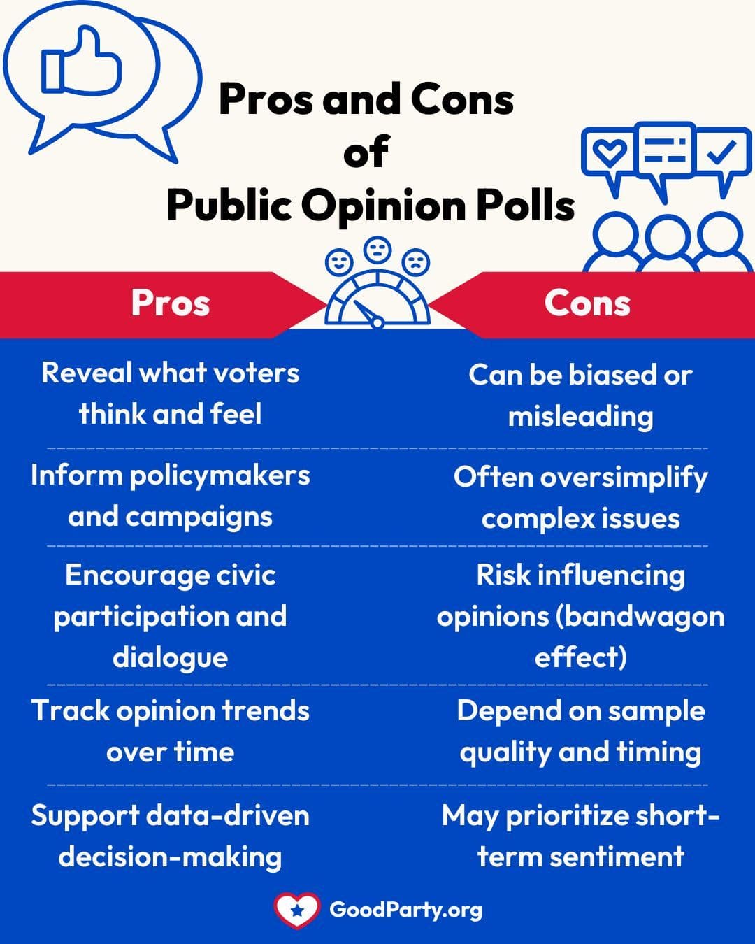 Like most tools of democracy, polls have both benefits and drawbacks. They can reveal valuable insights and strengthen civic participation, but they can also mislead when poorly designed or misused.